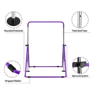 - Sturdy Safe Non-Slip Design- training monkey bar is made of kids safe durable stainless steel to ensure quality and safety.Large 57.9 inch wide secure base, two Round Sponge Bases Complement the Balance of Kip Bar Gymnastics, More Favorable to Both Sides of The Force and Grip.Four Slip Resistant Rubber Floor Rings on the Support Base Tubes Ensure the Gymnastics Bar Will Stay in Place, no worry of scratching floor.All Design Details are Considered for Child Safety.