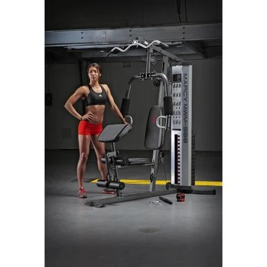 - Additional functions include high and low pulleys, a lat station and an adjustable preacher curl bicep pad