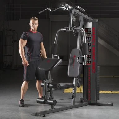 Enjoy a full-body workout from the comfort of your own home with this 150-pound stack home gym from Marcy. This durable steel home gym features independent pulley systems for upper and lower body exercises and helps you to increase muscle mass and burn calories. This upper body home gym also has leg extensions that are designed to develop lower body strength.