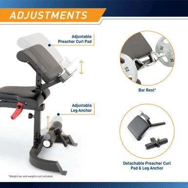 - Detachable preacher curl pad for targeted bicep exercises