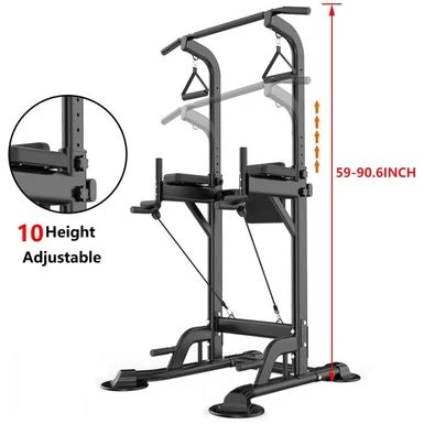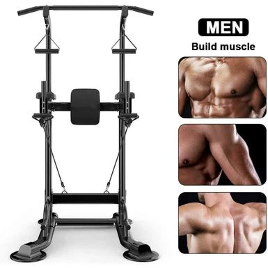 Get a full-body workout at home with the Tappio Multifunction Power Tower Pull Up Dip Station. This sturdy H-shaped design with a wide base provides maximum stability and safety for a variety of exercises, including vertical knee raises, push-ups, dips, pull-ups, and resistance band stretches. The high-quality steel construction and non-skid hand grips ensure durability and easy movement, while the arm and back cushions made of breathable PU leather provide comfort during your workout. With adjustable height and suction cups for flatness, this power tower is perfect for all fitness levels.